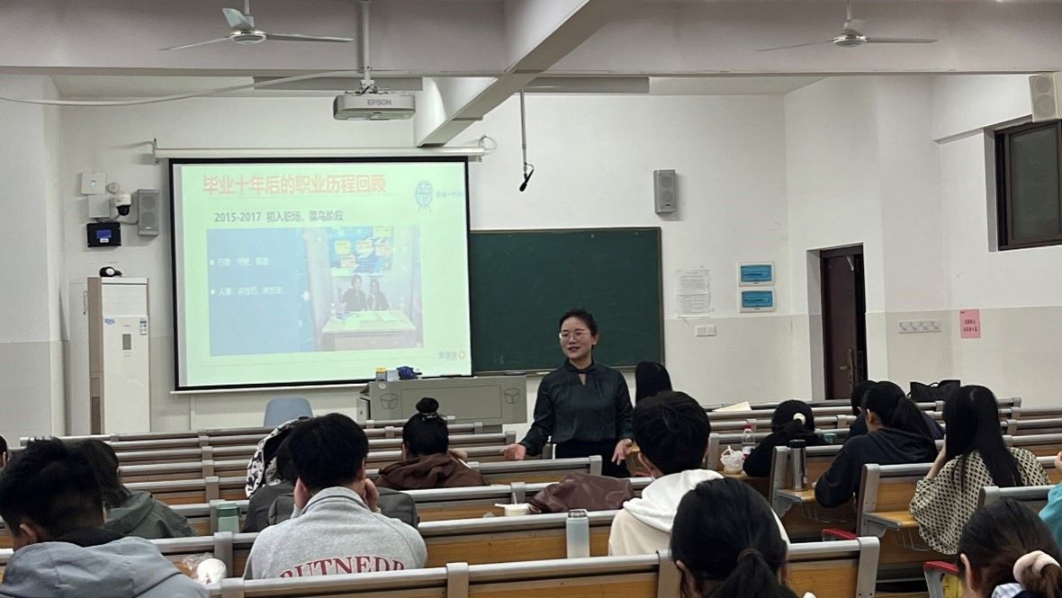 在“从毕业十年看金融学子择业就业之路”专题讲座中李静对自身毕业十年间的职业历程进行回顾,分享了初入职场、逐步成长到职场晋升三个不同阶段的经验,强调工作中时间观念和自我提升的重要性。