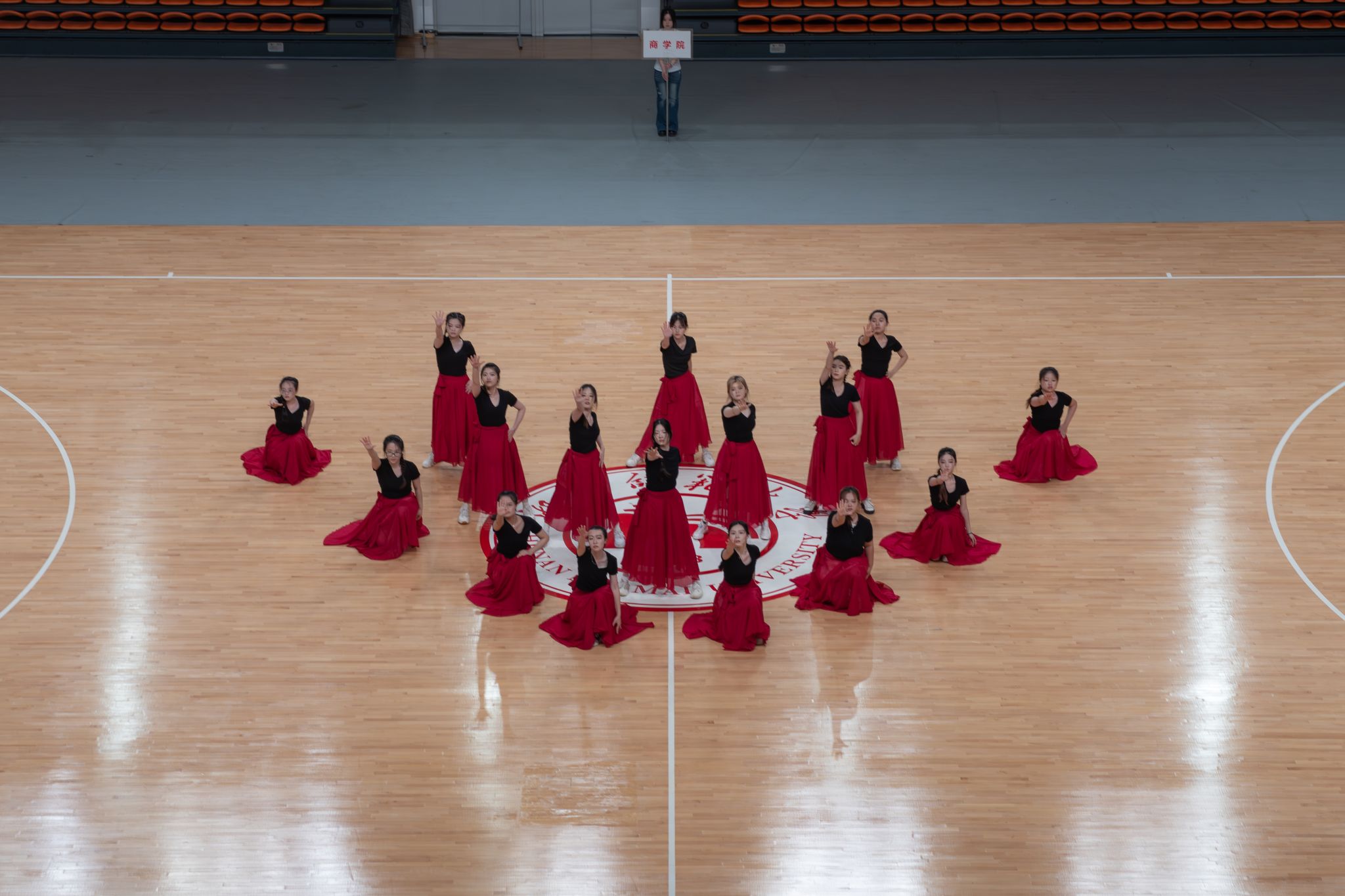 比赛开始,主持人致开幕词,纽约国际967线路测试本科生代表队以第二位的顺序出场表演,带来参赛作品《生命褶皱里的生命诗行》。作品分为两部分,前半部分队员们身着红色长裙,与黑色上衣相映衬,以端庄婉约的舞姿尽显典雅之美;后半部分队员们褪下红色长裙,变为白色短裙,以动感活泼的姿态诠释青春之美。经过两个月紧锣密鼓的排练,队员们密切配合、动作整齐,充满热情与力量,为观众带来了精彩的表演,生动演绎出“青春向未来”的比赛主题。观众席中,掌声迭起、呼声不断,健美操表演随之落下帷幕。