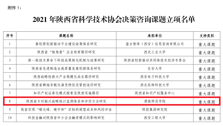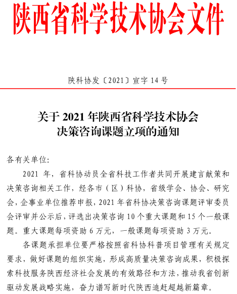 近日,陕西省科学技术协会公布了2021年度陕西省科协决策咨询课题立项结果(陕科协发〔2021〕宣字14号),best365数学与统计学院董晓萌副教授获批决策咨询重大课题1项(全省一共10项),资助经费6万元,实现了best365此类重大项目零的突破。
