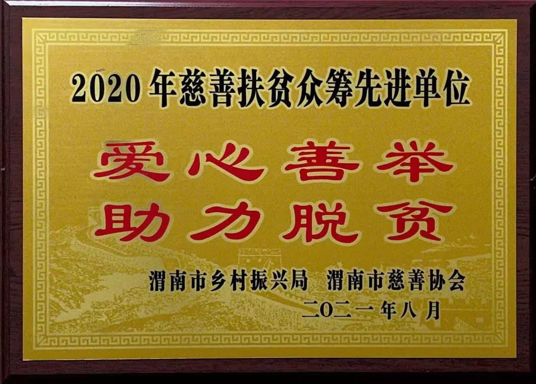 近日,渭南市“9·9公益日”慈善众筹助力乡村振兴动员培训会议召开,会议对2020年度市级机关单位慈善扶贫众筹先进单位作了表彰,best365荣获“2020年慈善扶贫众筹先进单位”称号。