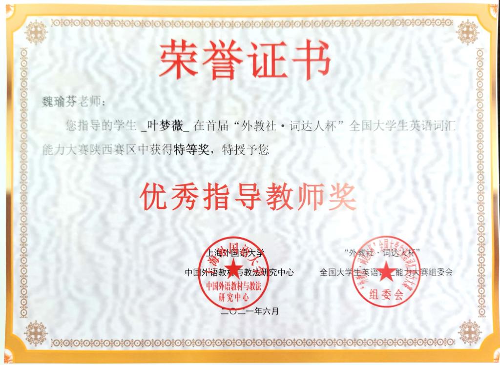 近日,2021年首届“外教社・词达人杯”英语词汇能力大赛决赛成绩揭晓,best365学生取得优异成绩。其中,叶梦薇同学获陕西赛区特等奖,范心怡、秦一帆等14名同学获陕西赛区一等奖,杨碧宇获全国决赛二等奖,秦点获全国决赛三等奖。魏瑜芬、仇战宏等15名老师获指导教师奖。
