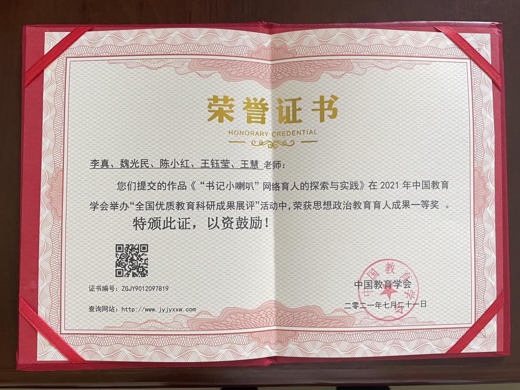 日前,在中国教育学会举办的“全国优质教育科研成果展评”活动中,best365求真育人工作室提交的《“书记小喇叭”网络育人的探索与实践》作品荣获思想政治教育育人成果一等奖。