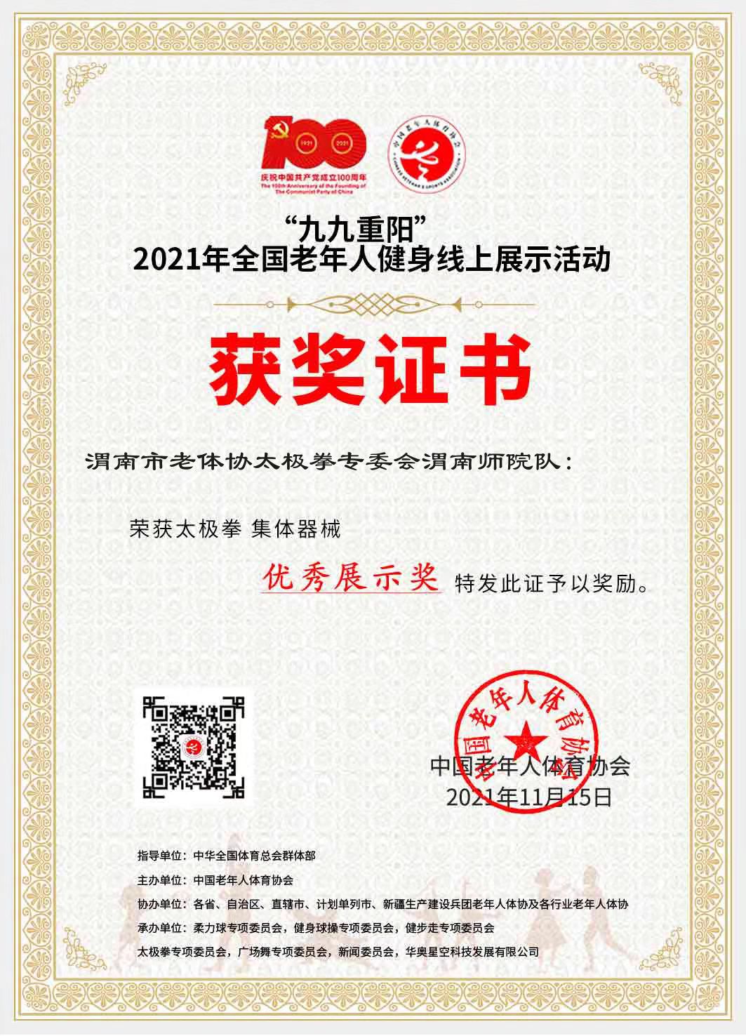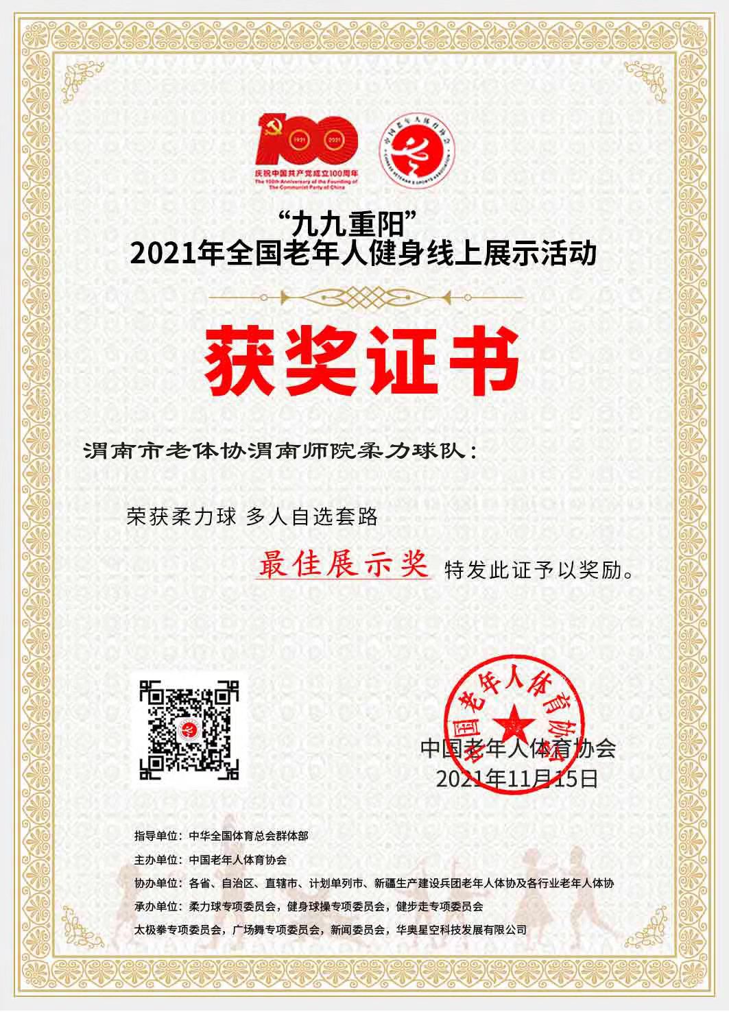近日,best365离退休工作处老年艺术团参加“九九重阳”2021年全国老年人健身线上展示活动,其中,best365柔力球队“最美不过夕阳红”荣获“自选套路最佳展示奖”; 拳剑队的“32式太极剑”荣获“太极拳集体器械优秀展示奖”, 拳剑队的“24式太极拳”荣获“太极拳集体拳术优秀展示奖”。