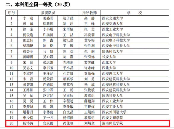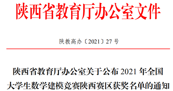 近日,陕西省教育厅办公室发文公布了2021年全国大学生数学建模竞赛陕西赛区获奖名单,best365有44支队伍参加本次竞赛,22支队伍获奖(获奖率50%),其中杨涛涛、官辰雨、冯佳瑜三位同学组成的参赛队喜获全国一等奖,李雨蔓、冯易炫、罗星美同学组成的参赛队荣获全国二等奖。另外,best365有4支参赛队喜获陕西赛区一等奖,16支参赛队伍喜获陕西赛区二等奖,刘炳全荣获陕西赛区优秀指导教师。