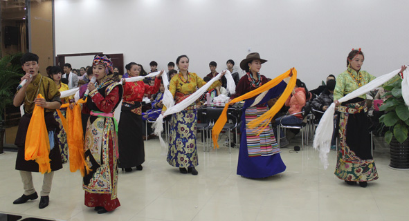 能歌善舞的藏族同学表演了独具特色的藏族歌曲和舞蹈,优美的旋律、动人的舞姿赢得了热烈的掌声。藏族同学给领导及嘉宾献上了洁白的哈达和亲手制作的甜茶,一声“扎西德勒”祝福所有来宾。藏族同学即兴表演了民族舞蹈、清唱民族歌曲,将联欢会气氛推向高潮,现场其他少数民族同学代表也送上了他们的节日祝福。
