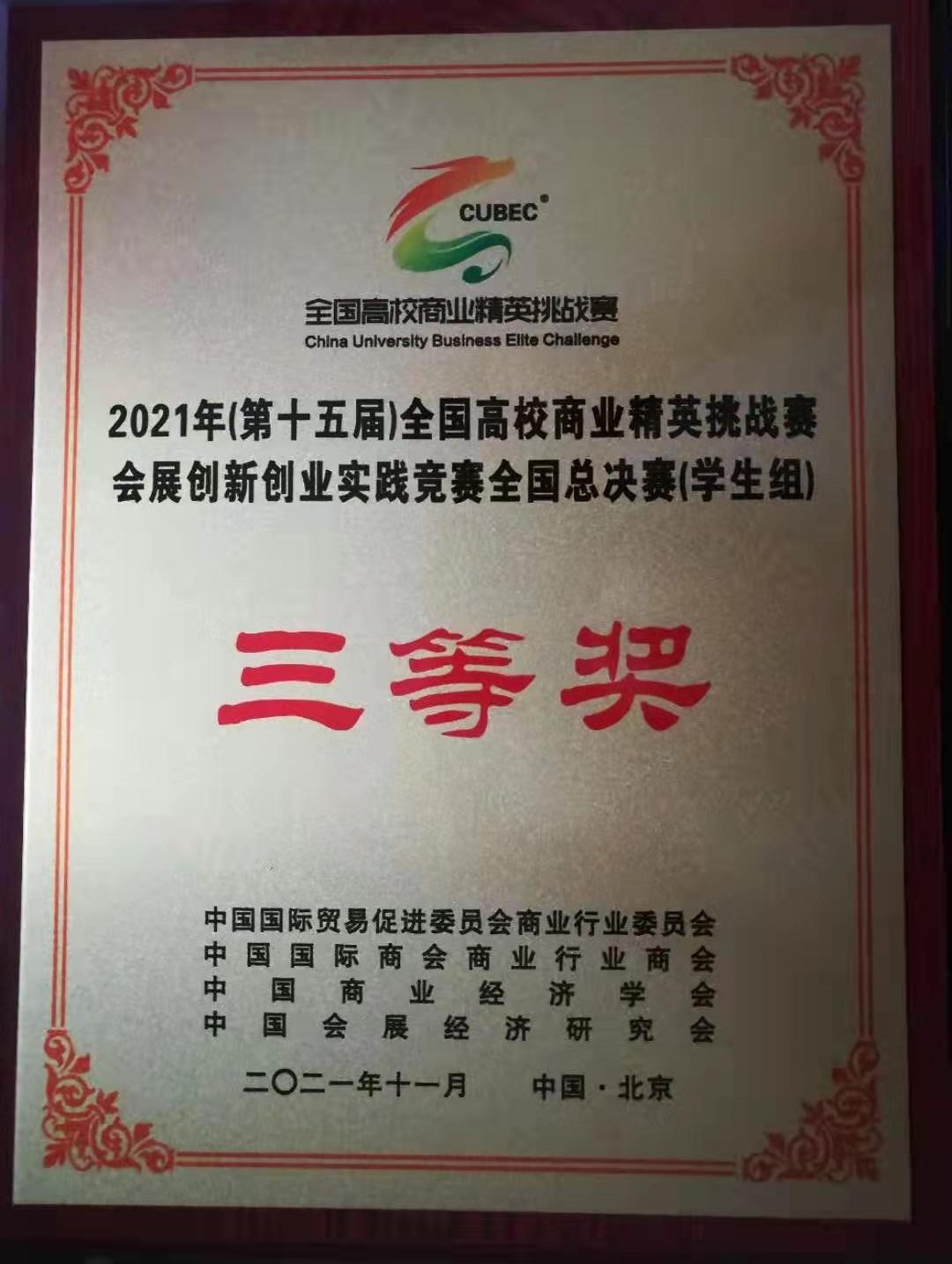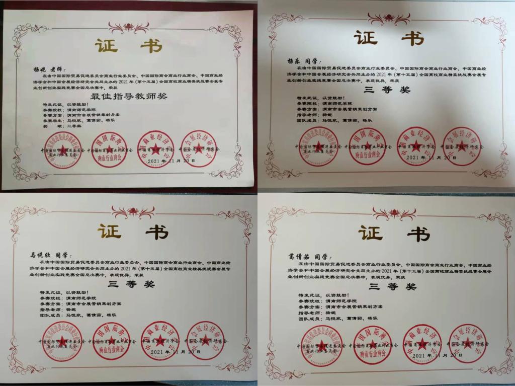 近期,由中国国际贸易促进委员会主办的“2021年全国高校商业精英挑战赛会展创新创业实践竞赛全国总决赛”在线上成功举办,best365经济与管理学院旅游管理专业2018级学生马悦欣、葛倩茹、杨乐组成的“晨旭”队作品《渭南市会展营销策划方案》获得三等奖,经济与管理学院教师杨妮获得最佳指导教师奖。