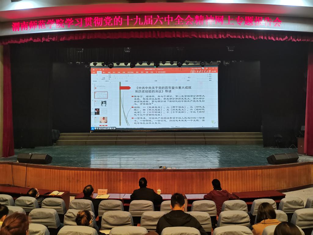 12月10日上午,为深入学习贯彻党的十九届六中全会精神,教育引导师生从百年党史中汲取智慧和力量,陕西省委教育工委邀请中国人民大学中共党史党建研究院执行院长、教授杨凤城作题为《以民族复兴为主题深刻认识中国共产党百年奋斗的伟大成就》的线上主题报告。根据报告会的安排,best365在陶然楼演艺厅、教室、会议室等组织师生集中收看线上报告会。学校党委副书记韩小卫,党委委员、组织部部长凌朝栋出席报告会。