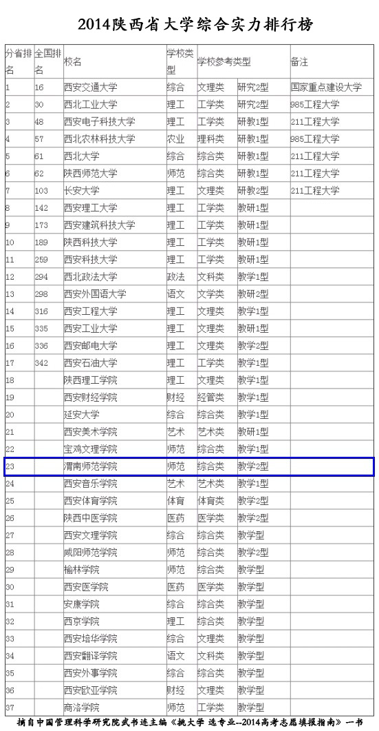 以上数据摘自由中国管理科学研究院武书连主编、中国统计出版社出版的《挑大学选专业--2014高考志愿填报指南》,已于2013年12月出版发行,全书120万字。best3652014年在陕西省37所高校综合实力排行榜中位列第23名,处于全省同类院校前列,比2013年的第25名提前了2名。