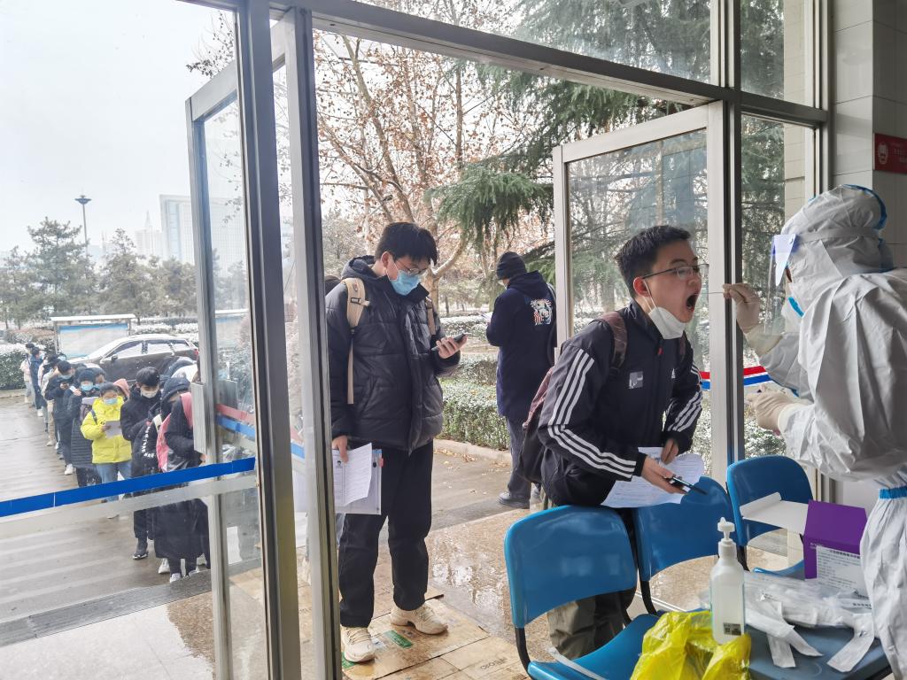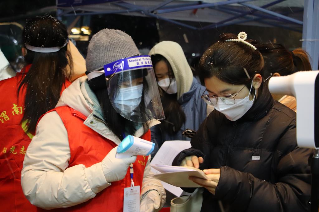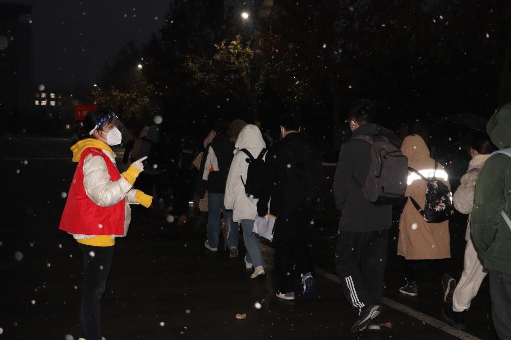 后勤保障组联系车辆、安排好住宿,帮助富平校区158名考生返回朝阳校区顺利参加考试。对所有考区设施设备进行检修,规范并做好消杀工作。考试期间,为社会考生和考务、监考、安保人员保障午餐供应。应对下雪路面湿滑的情况,在通往各考场路面上铺设防滑草垫,保证考生安全进入考场。