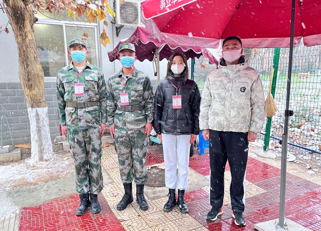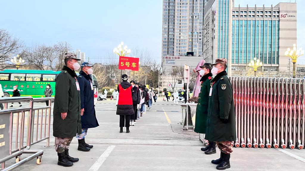 两天来,先后有50余名教导队队员参与相关服务工作。每天天不亮,他们自行集结起来,步伐整齐划一,精神饱满充沛,顶风冒雪奔向疫情防控志愿服务岗位,为广大考研学子保驾护航。在学校北门考点入口处,他们协助查验考生行程码、健康码、核酸报告以及测量体温等工作;在各考场外,他们一对一将考生送上班车,确保考生安全有序离开;在学校家属区门口,他们辅助工作人员做好进出人员的行程码与健康码查验与测温工作。其中有9名队员勇敢地穿上防护服,在学校北门口为考生查验测温,服务在疫情防控最前线。任务结束后,教导队教导员鲍佳瑞、队长王探伟说:“我们一个上午站下来,手脚冻麻了,但是心里真的很高兴,能为考研学子和学校出一份力我们义不容辞。”“队员们从早到晚站姿都是挺拔坚毅,防护服和口罩里充满了汗水与雾气,说话说的嗓子干疼都没有任何抱怨,他们是好样的!”