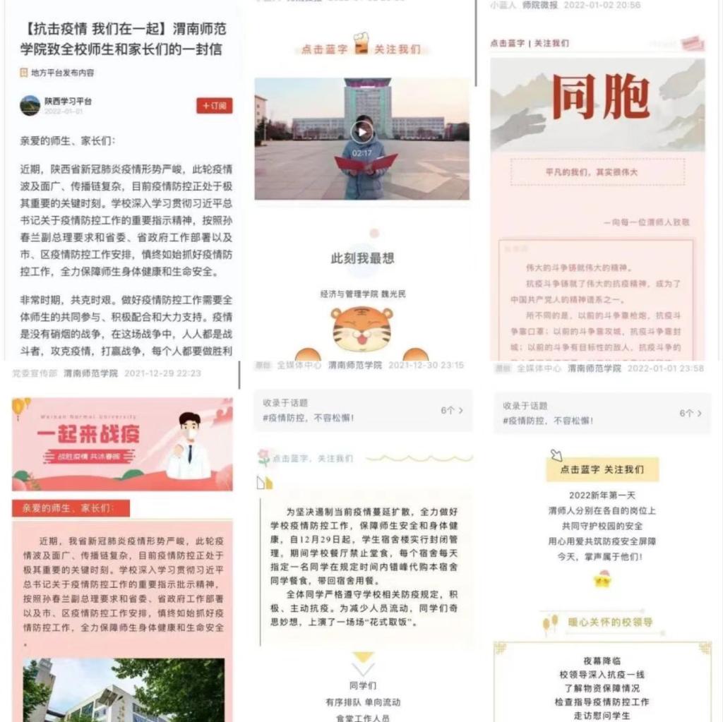 根据疫情发展形势和属地防疫要求,学校多措并举严密落实校园封闭管理下的疫情防控措施和要求。加强信息摸排和收集,精准摸排由西安、咸阳等地来校返校的各类人员,严格落实14天居家隔离+7天健康监测+3次核酸检测要求,阻断风险链条;加强师生健康管理和流动管理,分类精准掌握师生健康状况和行动轨迹,坚持“晨午检”健康打卡制度,落实跨区县位置变动审批备案;严格落实门禁制度,严格人员管控,加强校园巡逻,守好校门、把好关口,筑牢校园安全屏障;全面停止堂食,实行错峰购餐,严禁学生点外卖,倡导学生近期不购置快递,减少聚集和与外界接触风险;统筹做好疫情防控和教学工作,1月3日起,已全面启动线上教学授课,要求校院两级教学督导加大巡查指导,保障教学质量。