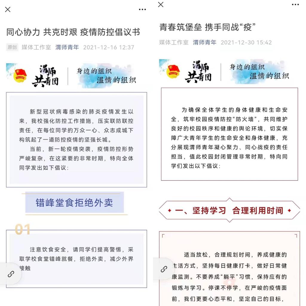 听党指挥,树立青春榜样。为号召全体团员青年行动起来,科学有序助力疫情防控工作,12月份,校团委分别发起《同心协力 共克时艰 疫情防控倡议书》《青春筑堡垒 携手同战疫倡议书》,倡导全体青年学生注意卫生、加强防护,坚持学习、合理利用时间,自带饭盒、减少白色垃圾,按需购物、共同维护秩序,及时清洁、保持宿舍卫生,抵制谣言、理性对待网络舆论。团学媒体工作室及时通过网络新媒体传达疫情防控具体信息,转发各级部门和学校有关疫情防控相关通告,鼓励渭师青年带头听从组织召唤,坚决服从学校统一管理,以实际行动亮身份、树形象,在疫情防控战斗中展现先进性。