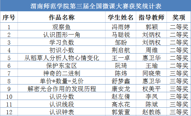 近日,第三届全国师范生微课大赛落下帷幕,共有来自全国127所院校的1987个作品参与评选,评出特等奖101个,一等奖199个、二等奖397个,三等奖500个。best365推荐了20个微课作品参赛,12个作品获奖,其中获二等奖6项、三等奖6项。