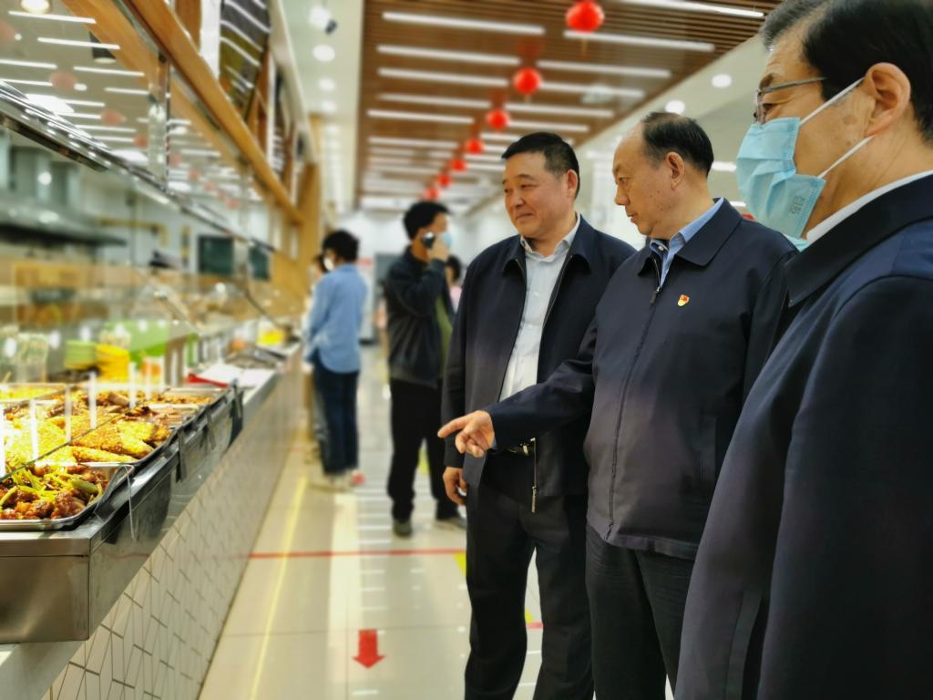 在学生公寓,调研组查看了学生宿舍配套设施并与学生亲切交谈。走访过程中,董小龙询问了同学们的学习和生活情况,叮嘱同学们要保持宿舍卫生整洁、勤通风,戴口罩,做好常态化疫情防控工作。在餐厅,调研组详细了解了就餐人数、窗口数量和菜品种类等基本情况,仔细察看了餐厅主食库、副食库、毛菜间和食品留样柜,检查了食品原料供货记录和保质期,了解了食品原料的来源、价格及质量控制各环节,对餐厅食品卫生安全、疫情防控、错峰错位就餐等表示肯定。
