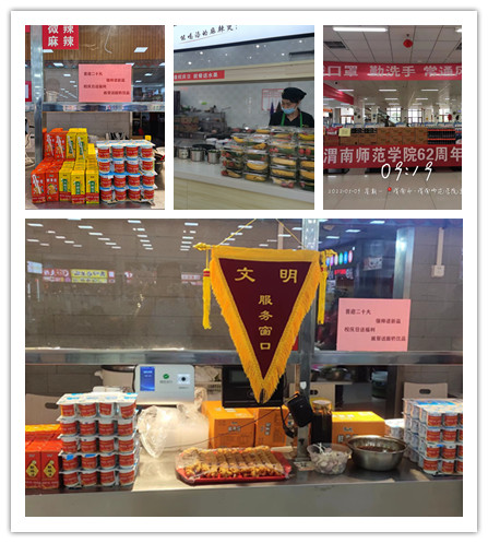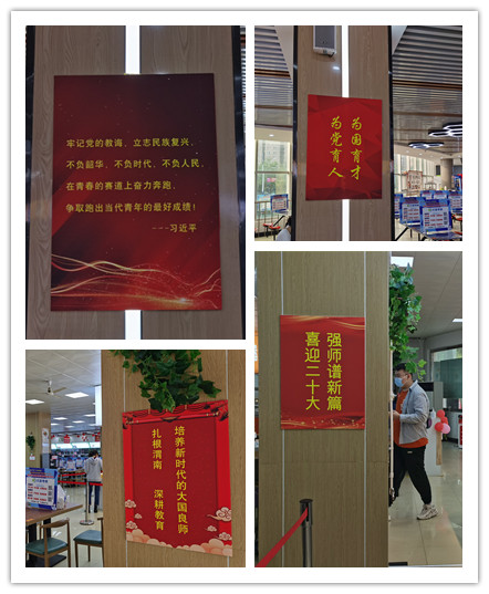 5月8日晚,后勤服务中心在餐厅内布设了校庆日专题宣传,增设了习近平总书记在中国人民大学考察时对全国广大青年“牢记党的教诲,立志民族复兴,不负韶华,不负时代,不负人民,在青春的赛道上奋力奔跑,争取跑出当代青年的最好成绩!”的殷殷嘱托和“喜迎二十大强师谱新篇”“扎根渭南深耕教育培养新时代的大国良师”“为党育人为国育才”宣传展牌,为校庆日营造喜庆热烈和踔厉奋发的良好氛围。