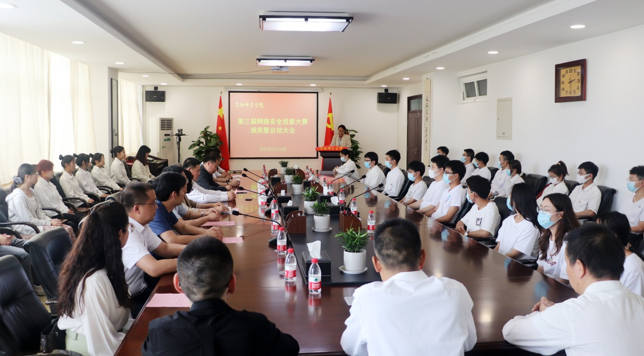 5月18日下午,由学校团委主办、计算机学院承办的best365中国官方网站第三届网络安全技能大赛颁奖暨总结大会在厚德楼第二会议室举行。学校党委书记卓宇、党委副书记汪勇、副校长王菊霞出席大会,团委副书记肖飞、计算机学院党政负责人、各专业建设负责人、获奖学生等参加大会。大会由计算机学院党总支副书记武楠主持。