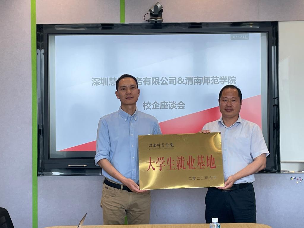 座谈交流后,汪勇为深圳慧通商务有限公司授大学生就业基地牌。