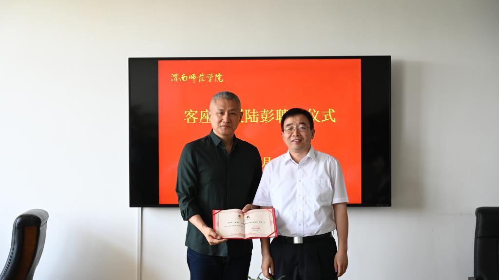 聘任仪式上,曹强向陆彭介绍了学校的办学历史及近些年的发展情况,传媒学院院长曹熙斌简要介绍传媒学院的专业设置、师资力量、人才培养等情况。