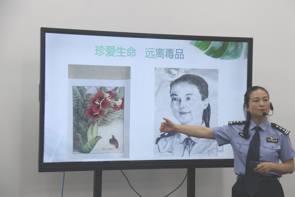 刘平首先介绍了毒品的概念、分类、危害性等基本特征,让师生对毒品有了初步了解;接着,刘平从自己经手的一些案例着手,向师生展示一些特殊服刑人员的绘画,带领大家在欣赏画作的过程中探索一个生活原本像美人蕉一样绽放的女子如何因为毒品而走向另一种生活。