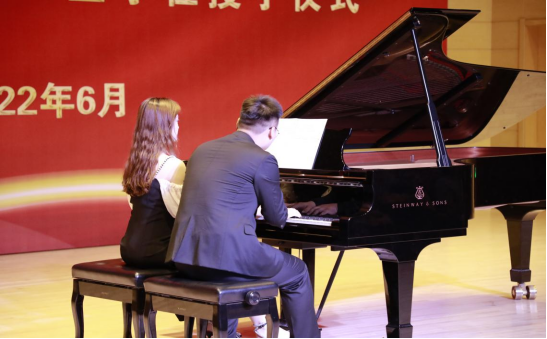 毕业班学生陈龙、刘臻雯钢琴四手联弹《对花》,将流行于河北、陕西和东北地区的民间小调挥舞于指尖,自信与稳健交相辉映,欢快、喜庆,充满了浓郁的地方特色。