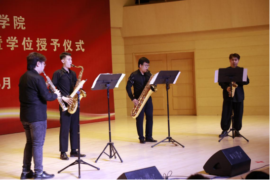 李逸轩老师与毕业班学生合奏的萨克斯四重奏《红旗颂》,跌宕起伏、舒展豪迈,穿过音符仿佛在仰望冉冉升起的五星红旗,能够看到在红旗的引领下,革命者们奋勇前行时沉着刚毅的脸庞。