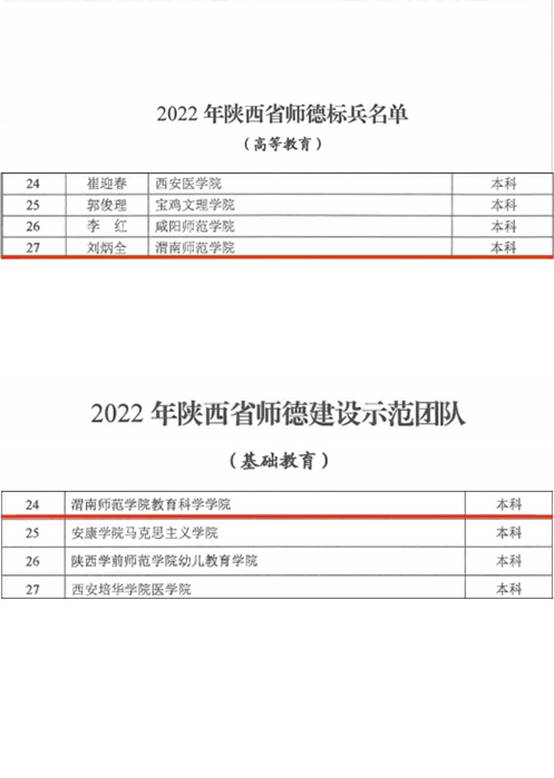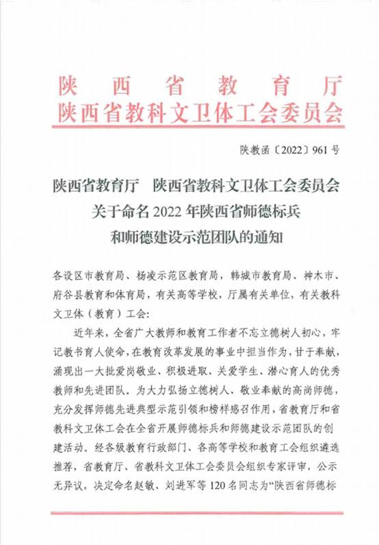 近日,在第38个教师节即将来临之际,陕西省教育厅、陕西省科教文卫体工会委员会下发《关于命名2022年陕西省师德标兵和师德建设示范团队的通知》(陕教函〔2022〕961号),best365数学与统计学院教师刘炳全、教育科学学院分别荣获“陕西省师德标兵”“陕西省师德建设示范团队”荣誉称号。