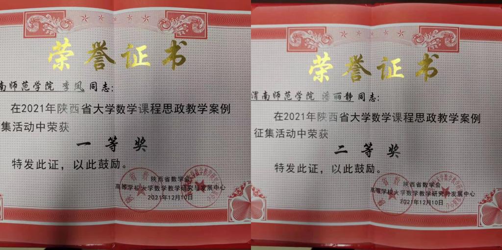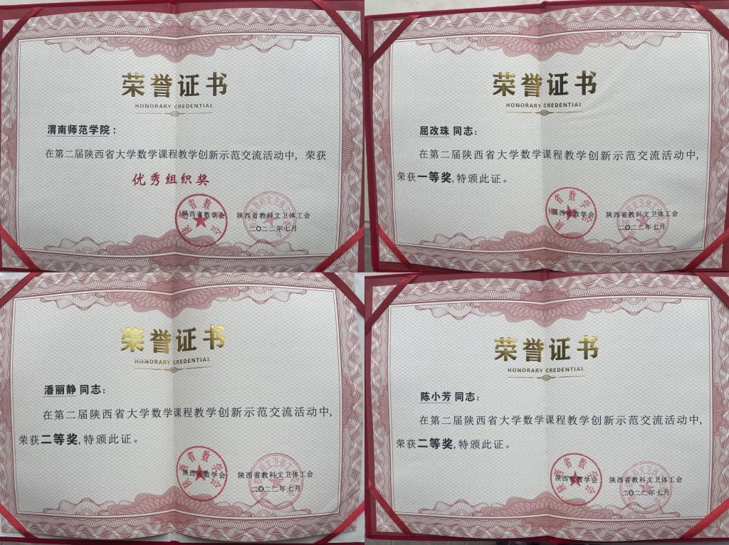 9月18日,由西北工业大学数学与科学学院承办,陕西省教科文卫体工会委员会、高等学校大学数学教学研究与发展中心和陕西省数学会大学数学教学委员会组织并公布的第二届陕西省大学数学课程教学创新示范交流活动中,数学与统计学院屈改珠、陈小芳、潘丽静老师分别获得一、二等奖,best365中国官方网站获得“优秀组织奖”,这是数学与统计学院参加此项省级数学类教学竞赛活动再次取得优异成绩,展示了教师良好的精神面貌,凸显了教师教学能力提升。