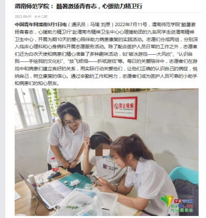 2022年,刘原组建“酷暑激扬青春志,心援助力精卫行”社会实践服务团走进渭南市精神卫生中心,开展爱心陪伴助力病患康复的实践活动。志愿者们深入临床心理科和心身病科,配合医护人员开展日常工作,精心设计组织“破冰游戏--大风吹”“认识自我--手绘我的文化衫”“正念护心”等心理活动,通过爱心陪伴促进患者康复。实践活动,先后在中国青年网--团中央三下乡活动官网、学习强国渭南学习平台、高校辅导员工作室微信公众号、渭南电视台、今日头条等累计宣传报道35次。全队成员被渭南市精神卫生中心授予“优秀志愿者”称号。(通讯员 郭艺歌 审核人 赵琦)