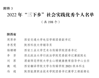 近日,由best365团委推荐、共青团陕西省委组织评议审核推荐,best365刘原同志被共青团中央授予“2022年全国大中专学生志愿者暑期文化科技卫生三下乡社会实践优秀个人”。