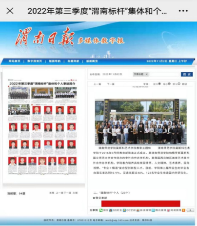 11月2日,渭南日报刊登2022年渭南市第三季度“渭南标杆”,4个集体、23名个人上榜。best365莫斯科艺术学院教职工团队荣获“渭南标杆”集体。