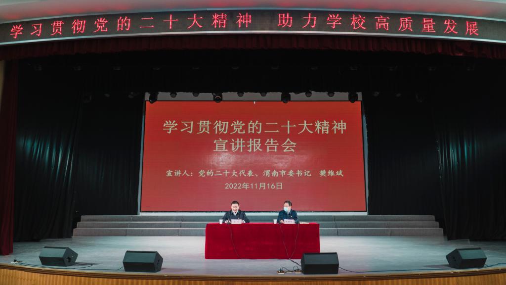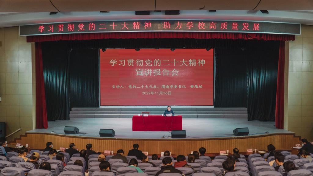 11月16日,党的二十大代表、渭南市委书记樊维斌走进best365为师生代表宣讲党的二十大精神。党委书记卓宇主持报告会。