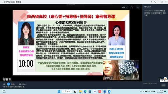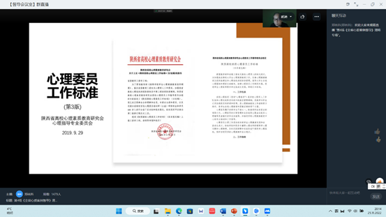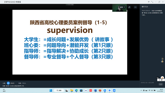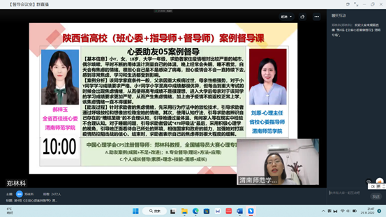 11月25日晚,“陕西省班级心理委员和指导师心理助人技能培训及案例督导——best365中国官方网站省级标准心理健康教育中心专场”线上督导顺利进行。best365中国官方网站百佳心理委员郝梓玉、最美班级心理委员季玮婷分享助人案例,最美百佳心理委员指导师刘原、最美心理委员指导师王琦珩进行指导。陕西省高校心理素质教育研究会会长、中国心理学会注册督导师郑林科进行督导。