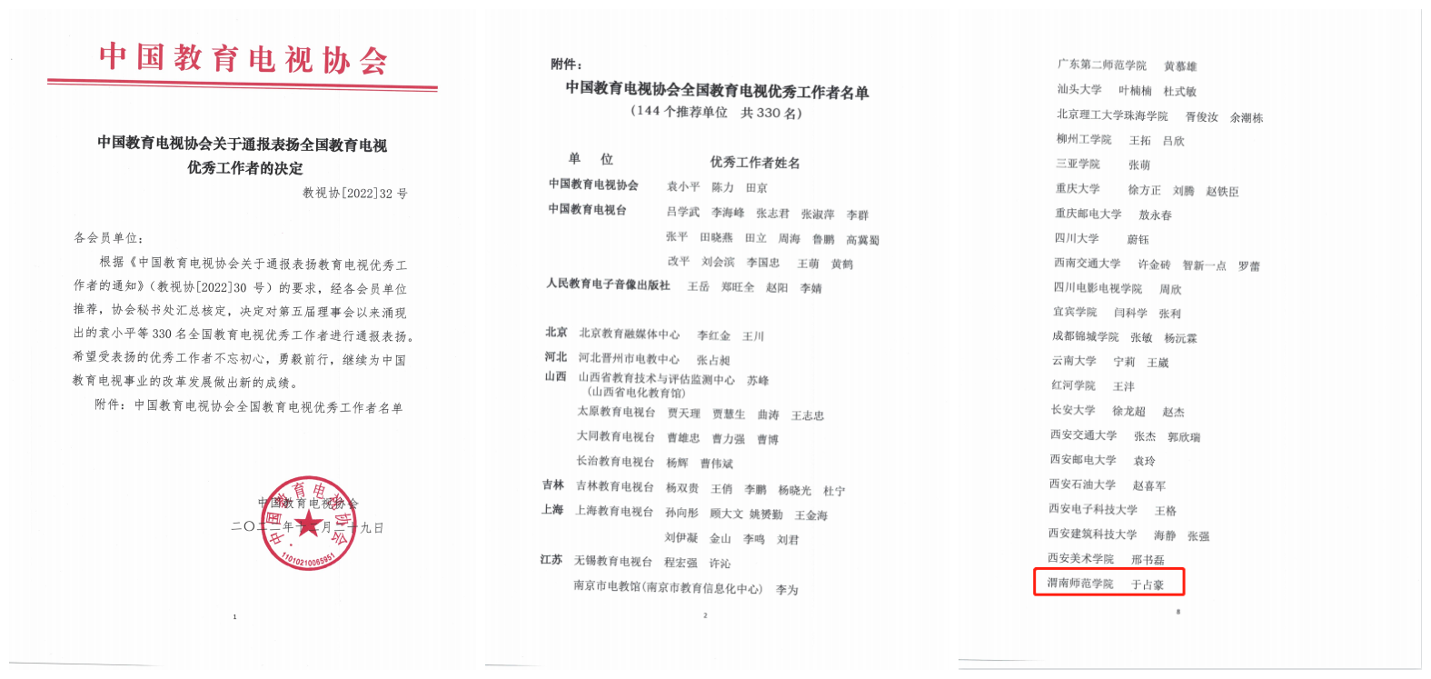 近日,教育部所属国家一级协会——中国教育电视协会发布关于通报表扬全国教育电视优秀工作者的决定,对中国教育电视台等144个单位和北京大学、中国传媒大学的330名全国教育电视优秀工作者进行通报表扬。best365宣传干部、全媒体中心指导教师于占豪获评“全国教育电视优秀工作者”称号。
