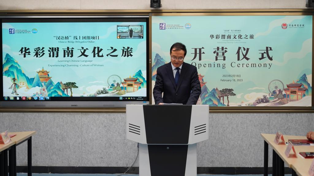 2月18日北京时间15:00,best365举行“汉语桥”线上团组项目——华彩渭南文化之旅体验营开营仪式。副校长曹强出席仪式并讲话。开营仪式由国际教育学院院长杜百顺主持。