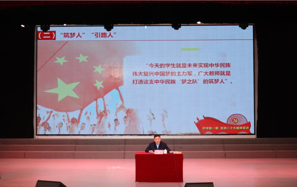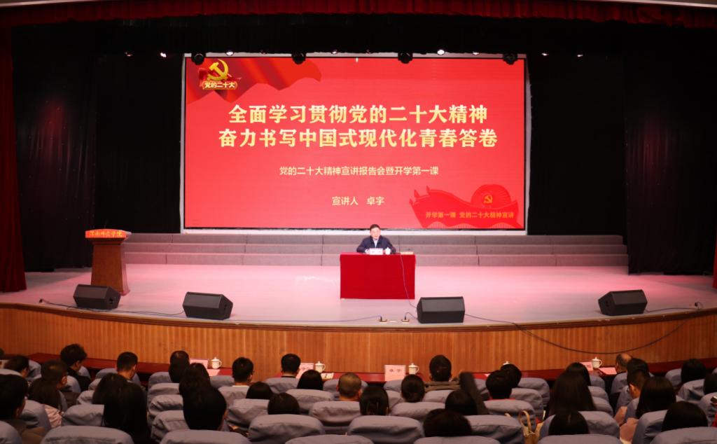 春回大地万象新,踔厉奋发正当时。2月24日下午,党委书记卓宇为best365党员干部、青年师生宣讲党的二十大精神,讲授“开学第一课”,以《全面学习贯彻党的二十大精神 奋力书写中国式现代化青春答卷》为主题,动员全校各级党组织、广大党员干部和师生员工切实把思想和行动统一到党的二十大精神上来,坚持不懈用习近平新时代中国特色社会主义思想武装头脑、指导实践、推动工作,切实将党的二十大精神转化为推动学校事业发展的务实举措,以昂扬的斗志和奋斗的姿态开启新的学期。校长张守华主持报告会。