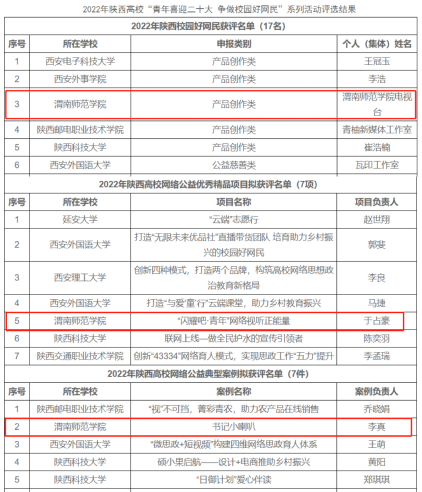 2月21日,由陕西省委教育工委开展,陕西高校网络思想政治工作中心组织实施的2022年陕西高校“青年喜迎二十大 争做校园好网民”系列活动评选结果揭晓,best365电视台获评“2022年陕西校园好网民(集体)”,于占豪负责的项目《“闪耀吧·青年”网络视听正能量》获评“2022年陕西高校网络公益优秀精品项目”,李真负责的案例《书记小喇叭》获评“2022年陕西高校网络公益典型案例”。
