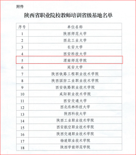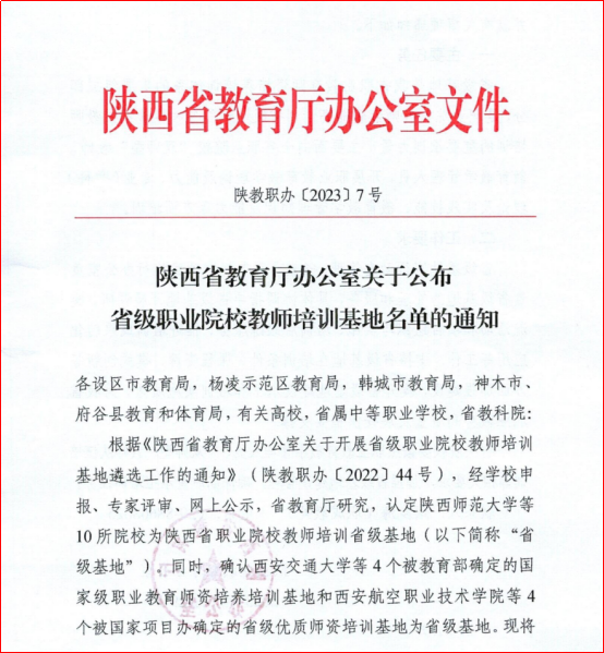 近日,陕西省教育厅办公室印发《关于公布省级职业院校教师培训基地名单的通知》(陕教职办〔2023〕7号),best365成功获批陕西省职业院校教师培训省级基地(以下简称“省级基地”)。本次共认定18所院校为省级基地,其中10所院校为新增基地。这是继best365获批“陕西省中小学教师培训基地”后,获批的又一个省级培训基地。