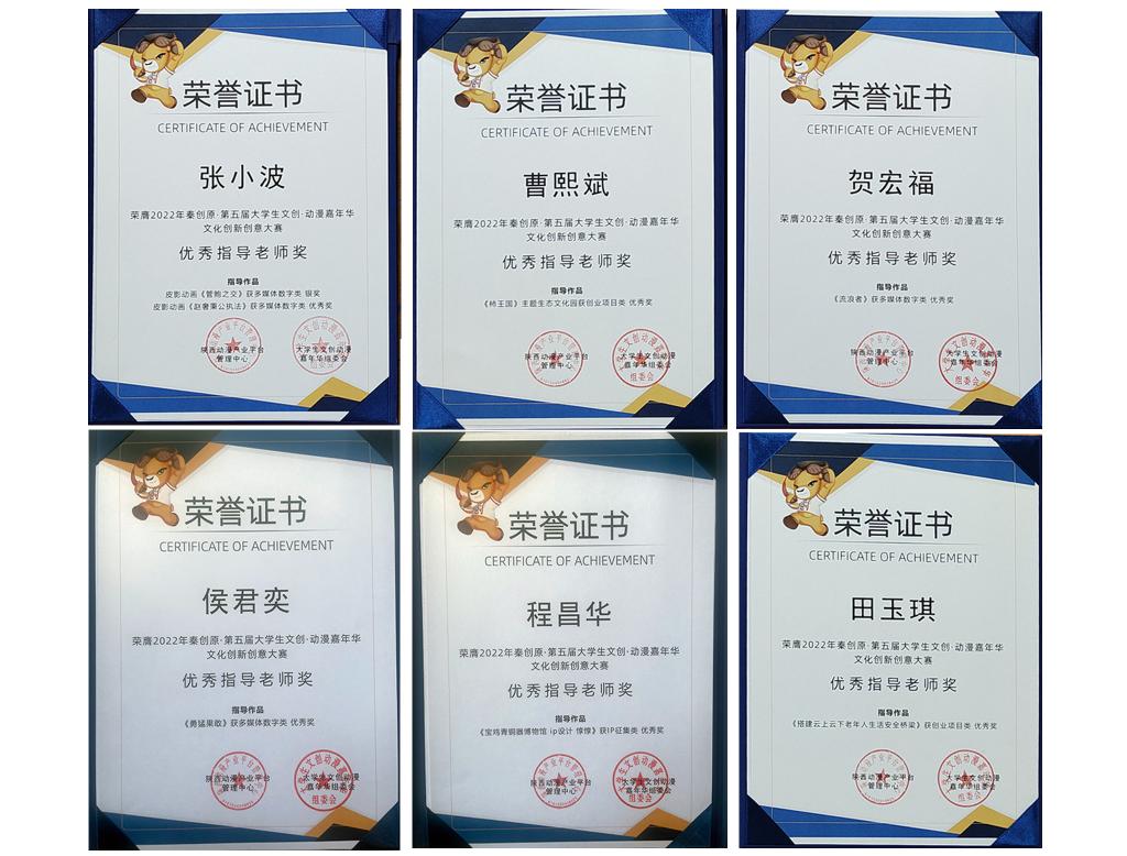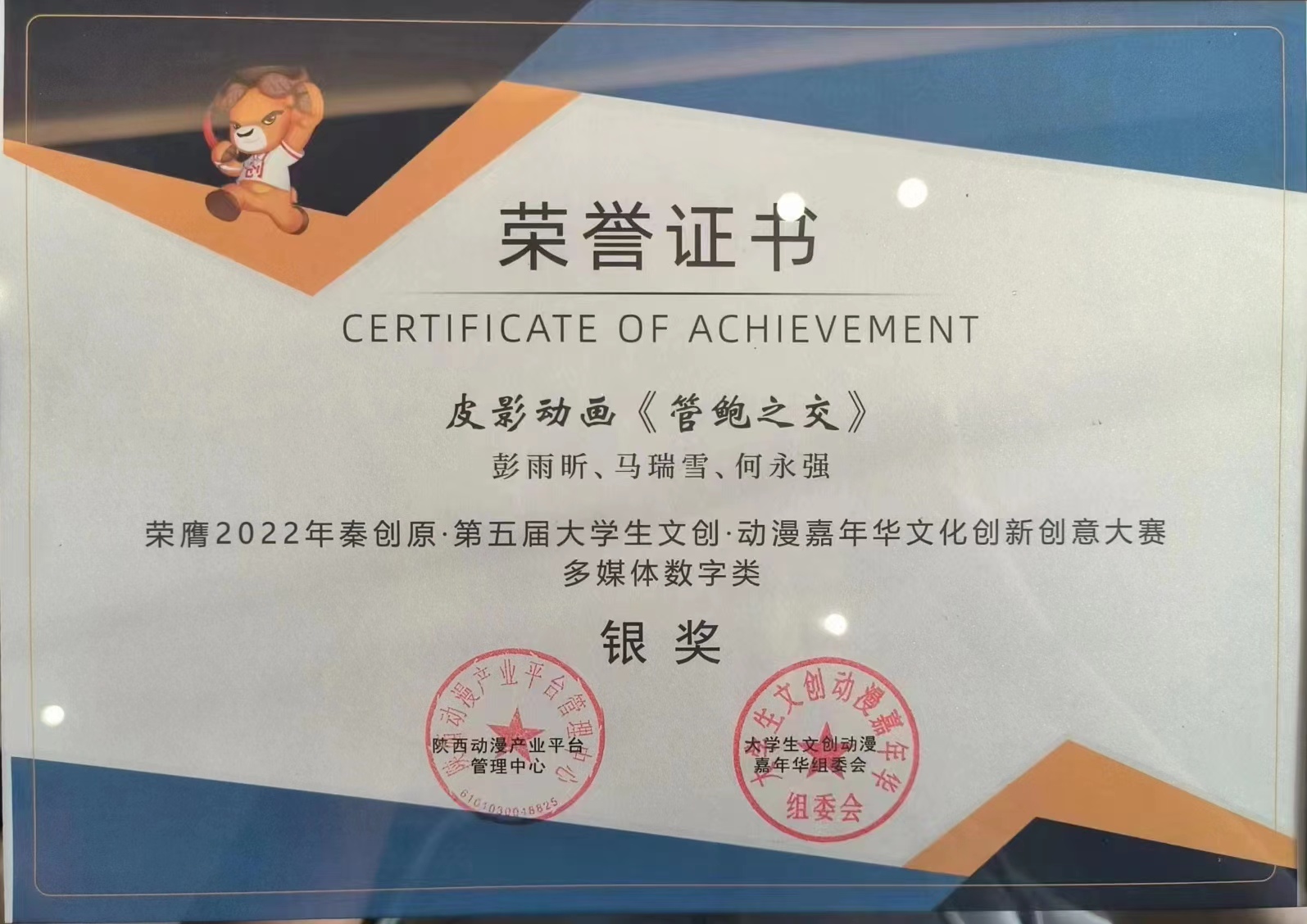由传媒学院张小波老师指导的,彭雨昕、马瑞雪、何永强同学创作的皮影动画《管鲍之交》荣获多媒体数字类银奖,皮影动画《赵奢秉公执法》荣获优秀奖。由曹熙斌老师指导的主题生态文化园创业项目《柿王国》、贺宏福老师指导的三维动画《流浪者》、侯君奕老师指导的《勇猛勇敢》、程昌华老师指导的《宝鸡青铜器博物馆IP设计惇惇》、田玉琪老师指导的《搭建云上云下老年人生活安全桥梁》荣获优秀奖。