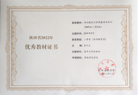 近日,陕西省教育厅公布了2022年陕西普通高等学校优秀教材获奖名单,best365教育科学学院吴代文老师主编的《网站建设与管理基础及实训(PHP版)(第2版)》教材荣获陕西省高等教育优秀教材二等奖。