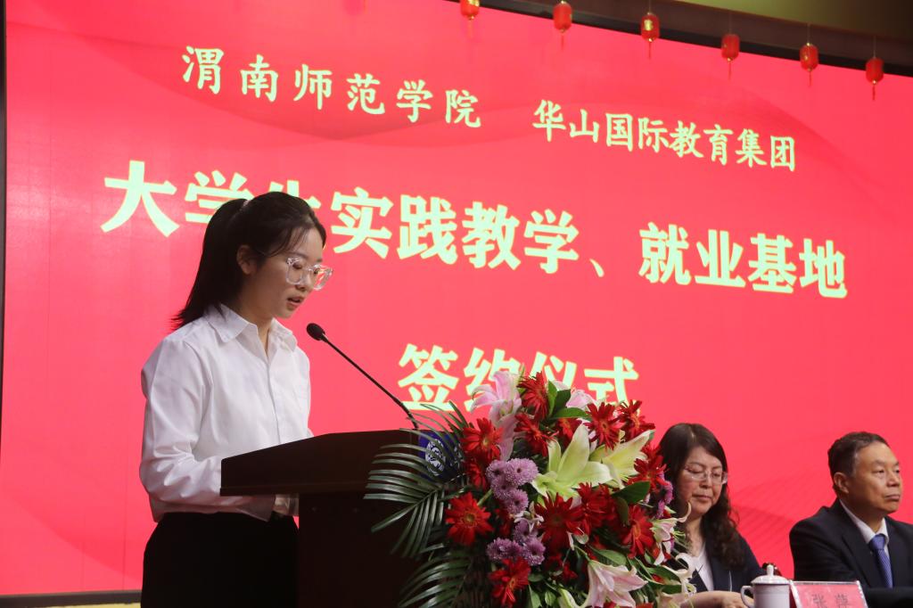 签约仪式上,渭南轨道交通运输学校副校长刘可代表集团致欢迎词。马克思主义学院思政203班张嘉怡作为学生代表进行发言。