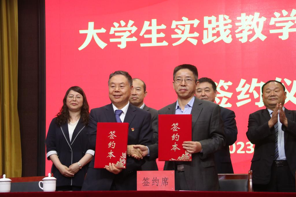 卓宇、任永敏共同为“实践教学基地”、“大学生就业基地”揭牌;张萍代表马克思主义学院与杨森望、肖鹏、朱相心签订实践教学基地协议;马克思主义学院党总支书记赵国峰与张六民签订就业基地协议。