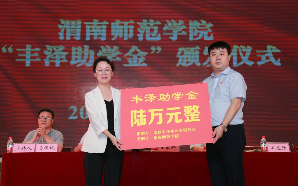 田应强代表陕西丰泽实业有限公司向best365捐赠2022—2023学年丰泽助学金6万元,田耿辉代表学校接受捐赠。