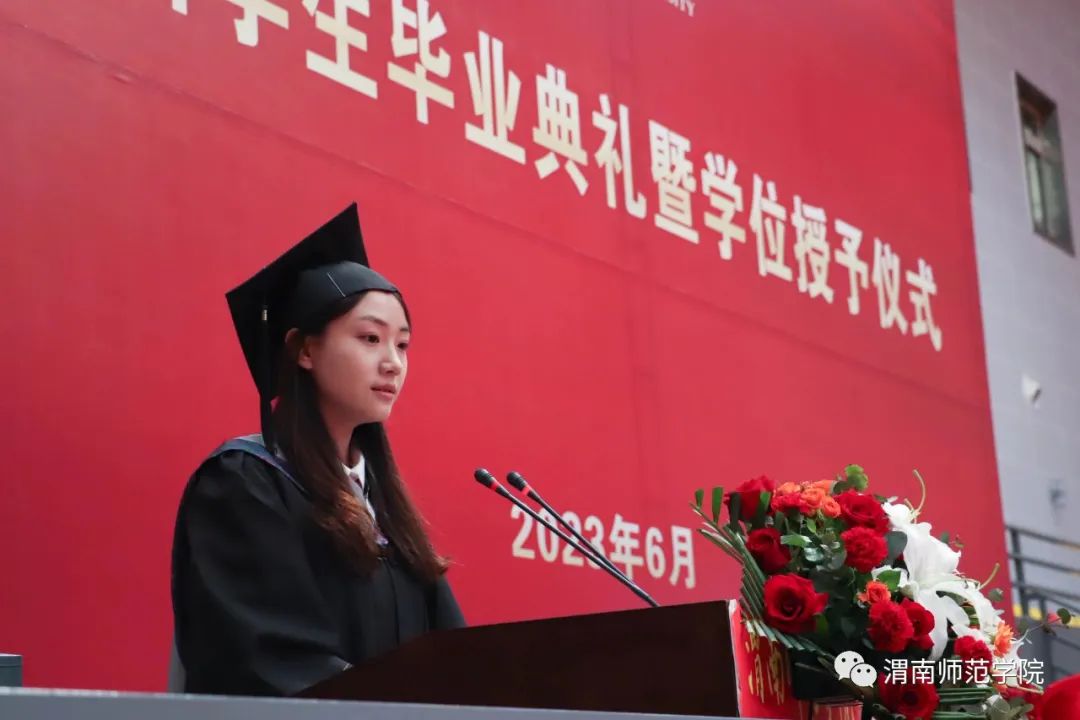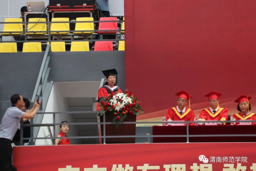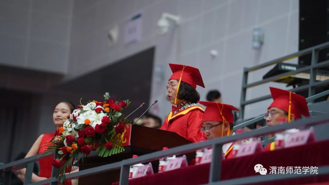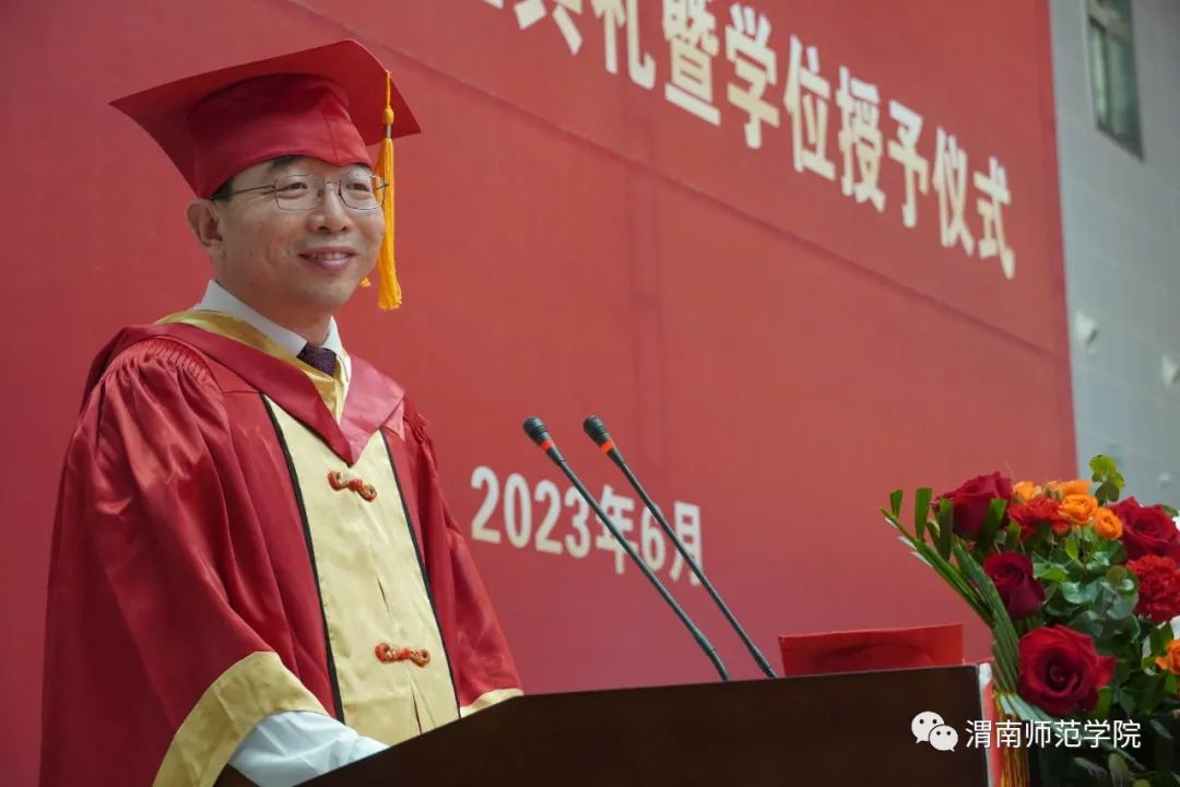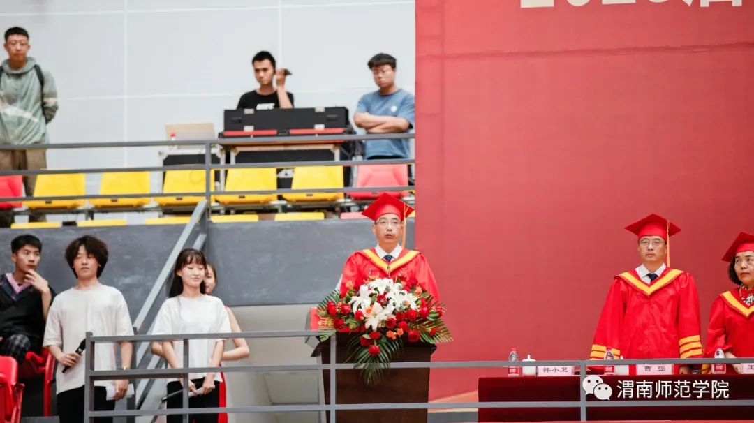 校长张守华在致辞时勉励2023届全体极其幸运、历尽艰辛而又光彩熠熠的毕业生“后生”“后浪”们,要接续奋斗,不负时代,珍惜青春韶华,将“青春梦”融入“中国梦”,怀揣与时代同步伐、与人民共命运的伟大志向,树立为祖国为人民永远奋斗、赤诚奉献的坚定理想;要艰苦奋斗,砥砺前行,秉承渭师人育人为本、为国担当、艰苦创业、勇争一流的优良传统,知重负重,“不甘人后、奋起直追”;要顽强奋斗,站稳讲台,能够在新技术奔涌而来之际,做时代的参与者,勇立潮头,做“四有好老师”,在强国建设的事业中、民族复兴的伟业中,不断贡献青春的力量。
