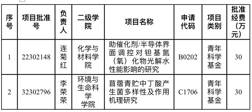 近日,国家自然科学基金委公布了2023年度国家自然科学基金立项名单。best365获批立项两项,类别为青年科学基金项目,每项资助经费30万元,共计60万元。