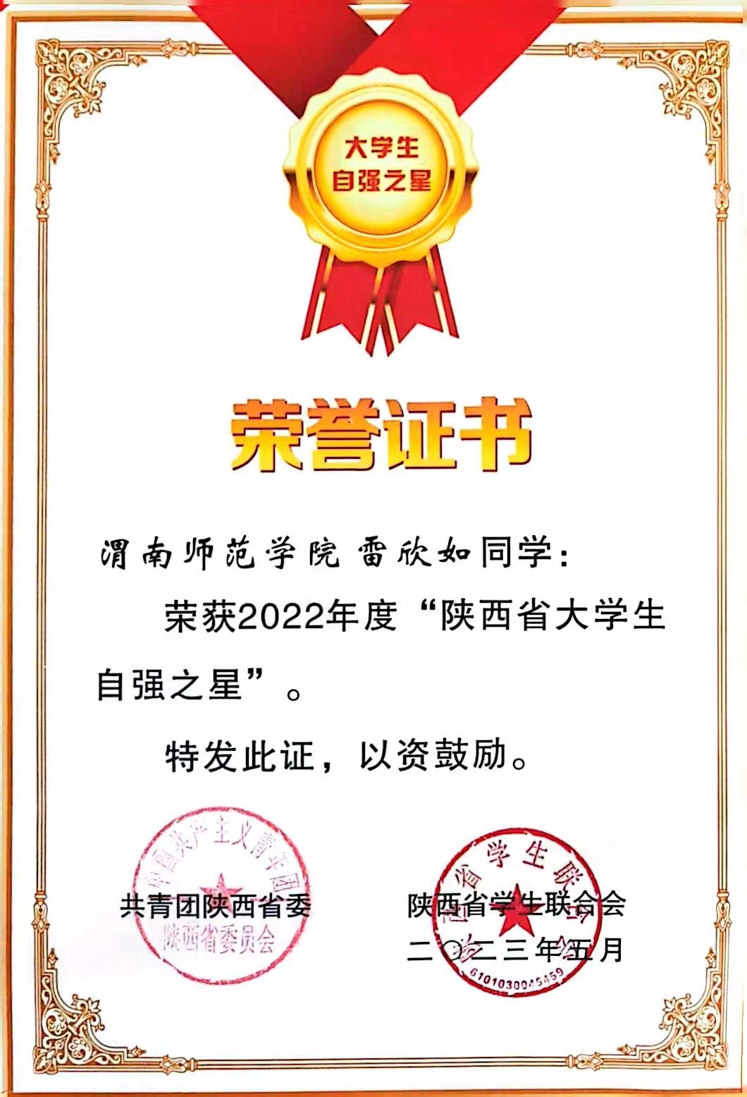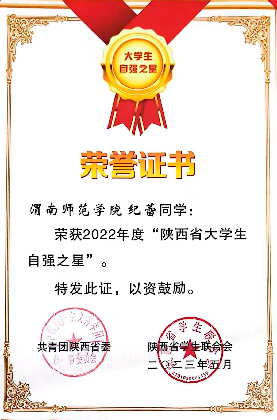 近日,由共青团中央、全国学联指导,中国青年报社、新东方教育科技集团、中国青年创业就业基金会联合开展的2022年度“中国大学生自强之星”推报活动结果揭晓。经学校团委推荐、省级初评、全国评审等环节,best365来自人文学院汉本194班纪蕾和数学与统计学院学院数本211班雷欣如双双入选,荣获2022年度“中国大学生自强之星”奖学金,获奖人数再创新高。