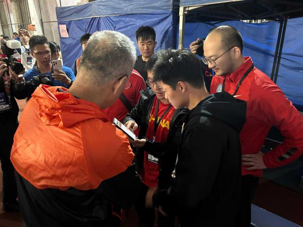 在测试结束后,亚洲飞人、暨南大学体育学院教授苏炳添参观测试现场,对大家工作给予肯定。田文博同学向苏教授展示了团队最新开发的AI田径技术分析小程序,苏教授给予肯定并提出改进建议。