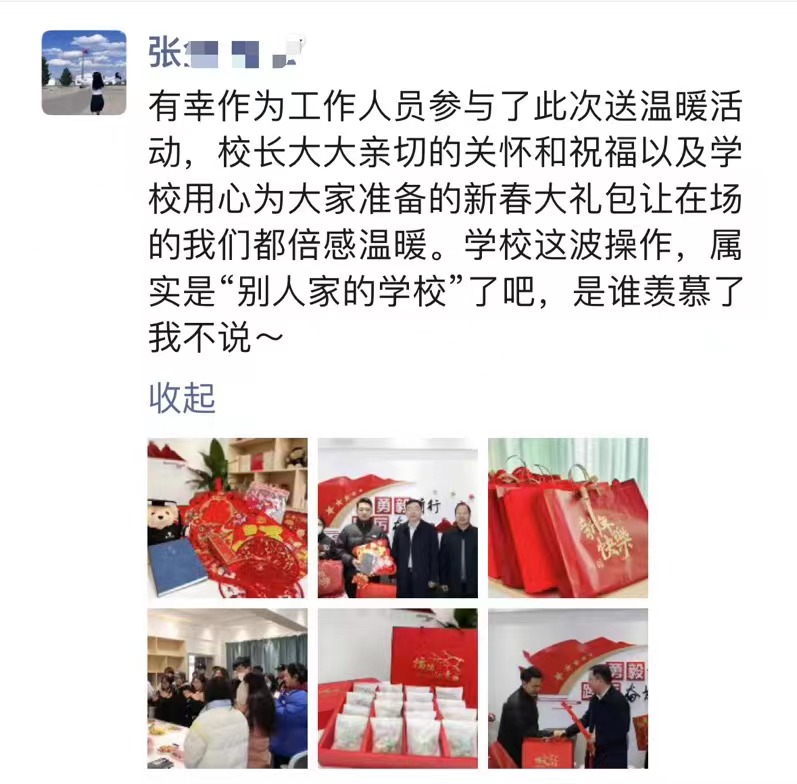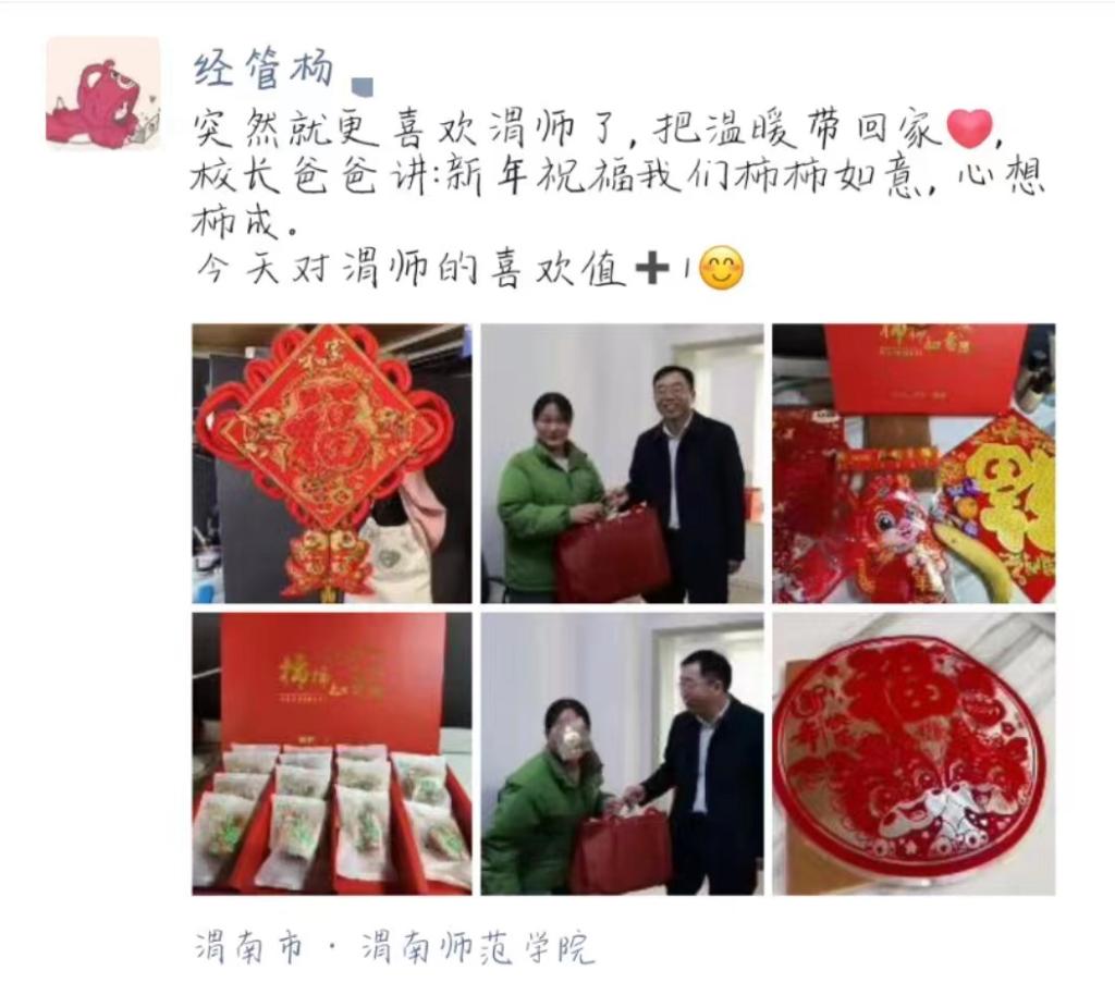 无需申请,主动关怀。学校的这一暖心举措,受到同学们的纷纷点赞。来自经管学院的杨同学说:“突然就更喜欢渭师了,把温暖带回家”。参与了整个活动筹备过程的张同学说:“有幸作为工作人员参与了此次送温暖活动,校长亲切的关怀和祝福以及学校用心为大家准备的新春大礼包让在场的我们都倍感温暖。学校这波操作,属实是‘别人家的学校’了吧,是谁羡慕了我不说~”
