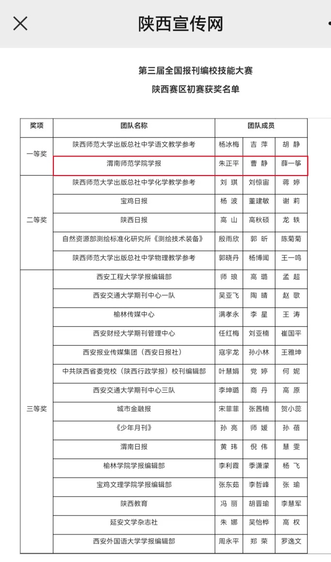 据悉,该项赛事每两年举办一次。本次大赛由陕西省新闻出版局主办、陕西省高等学校学报研究会承办,全省报纸、期刊单位组建了107个团队共321名采编、编辑校对人员、新媒体从业人员参赛,共决出团队一等奖2个、二等奖5个、三等奖15个。