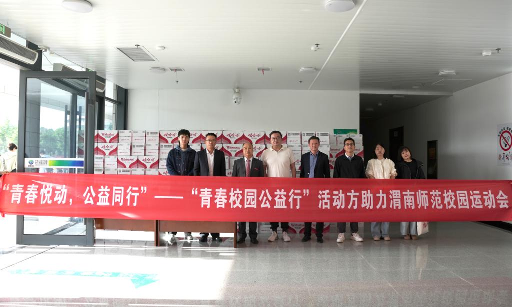 在学校大学科技园和校地合作与校友工作处的积极联络下,本次活动课题组及公益计划发起方向学院捐赠三万瓶纯净水,助力参赛大学生赛出风采,赛出水平,取得优异成绩。学院副校长卢爱刚代表学校接受捐赠,校园公益计划西安地区负责人阮庆凯代表活动方参加了本次体育节,并与校领导和相关师生亲切合影。