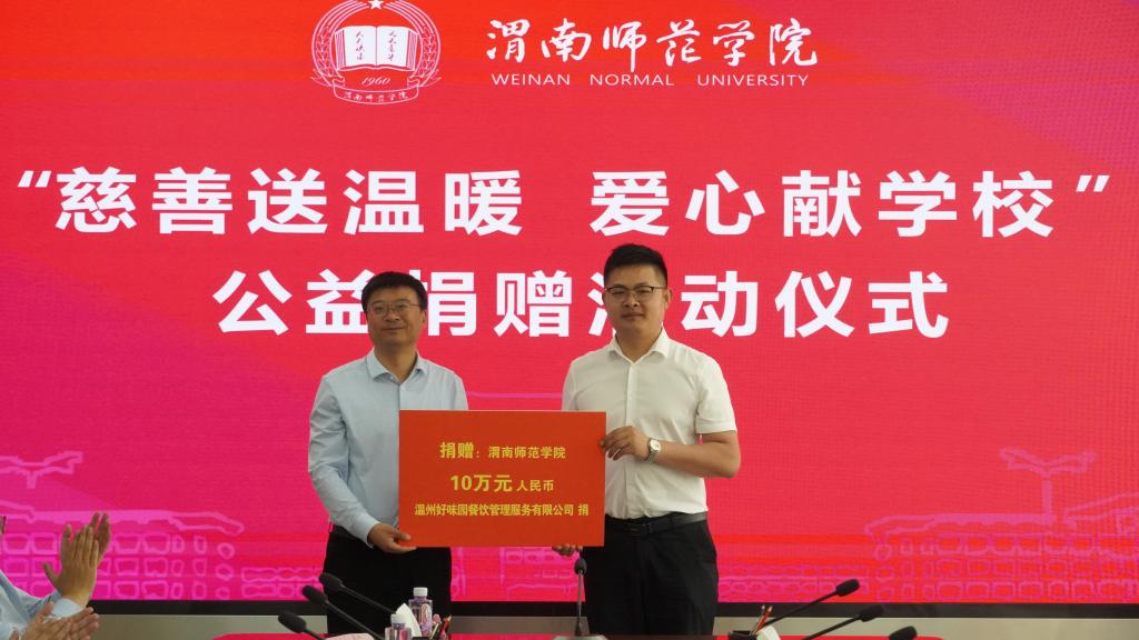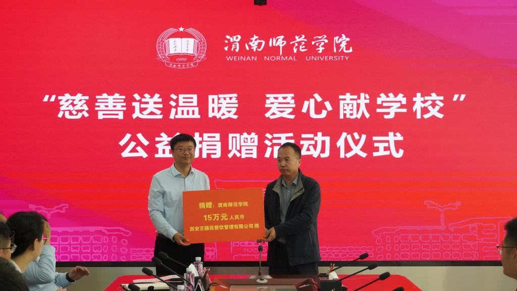 5月9日下午,学校举行“慈善送温暖,爱心献学校”公益捐赠活动仪式。江苏迪生建设集团有限公司驻陕西省总经理吴晓东、西安百膳苑餐饮管理有限公司总经理马小虎、温州好味园餐饮管理服务有限公司西北区域市场运营总监程先锋,副校长常青林出席仪式。校地合作与校友工作处处长王建平主持会议。